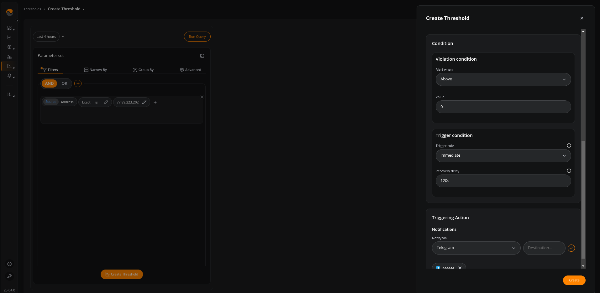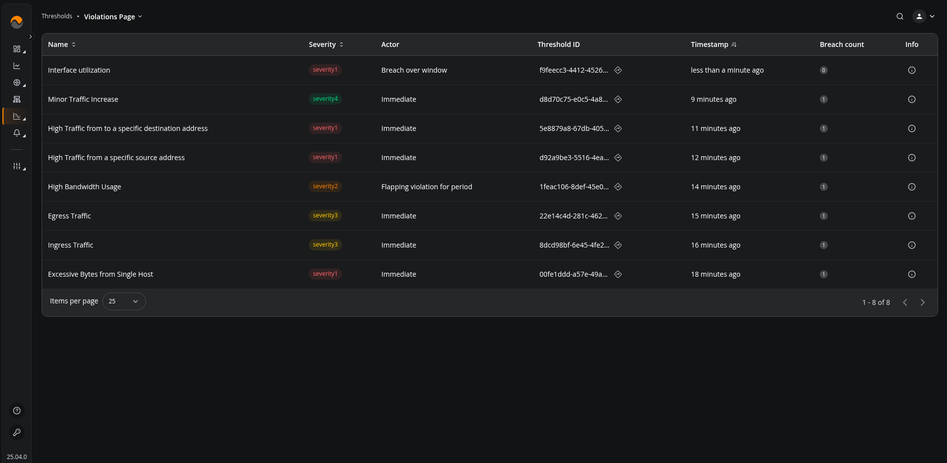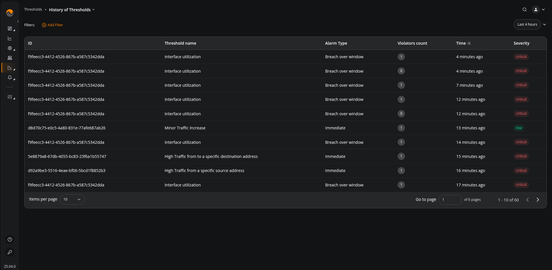 The Thresholds feature allows users to define traffic conditions and receive alerts when predefined limits are reached or exceeded. This eliminates the need for continuous manual monitoring by automatically identifying abnormal or unwanted network behavior.